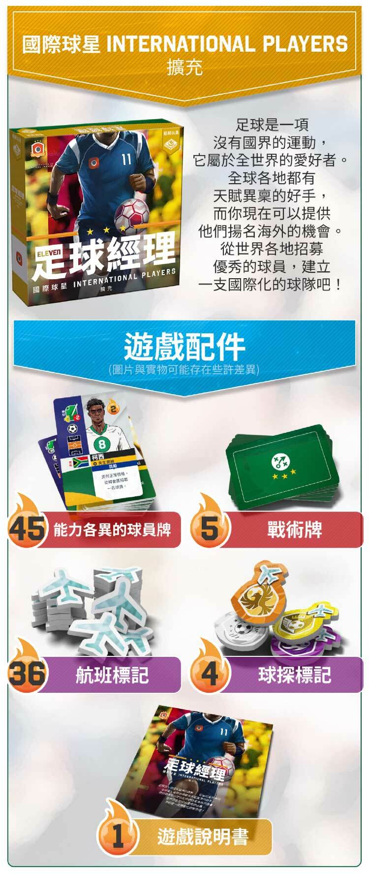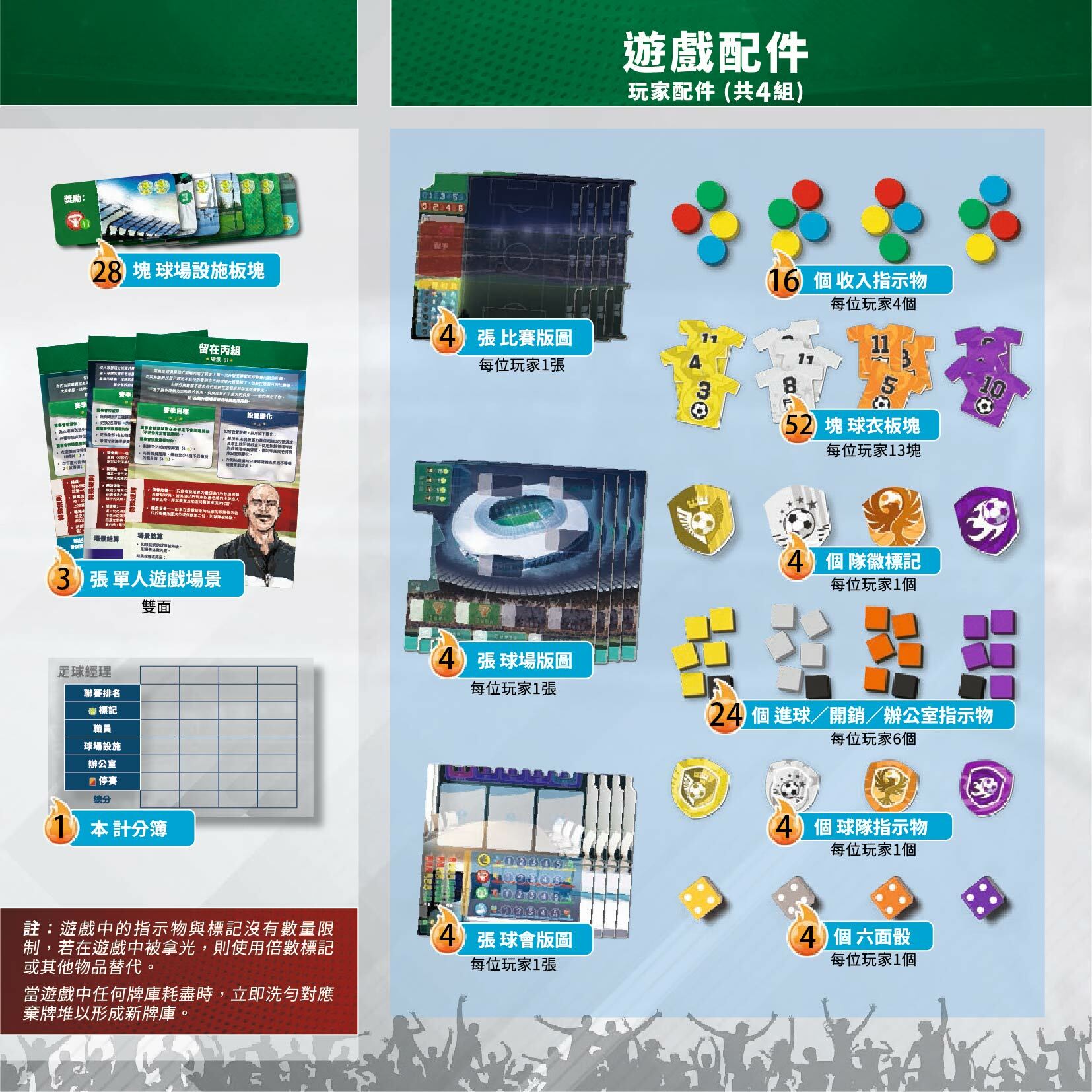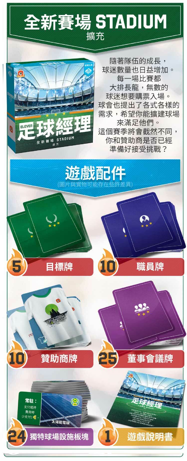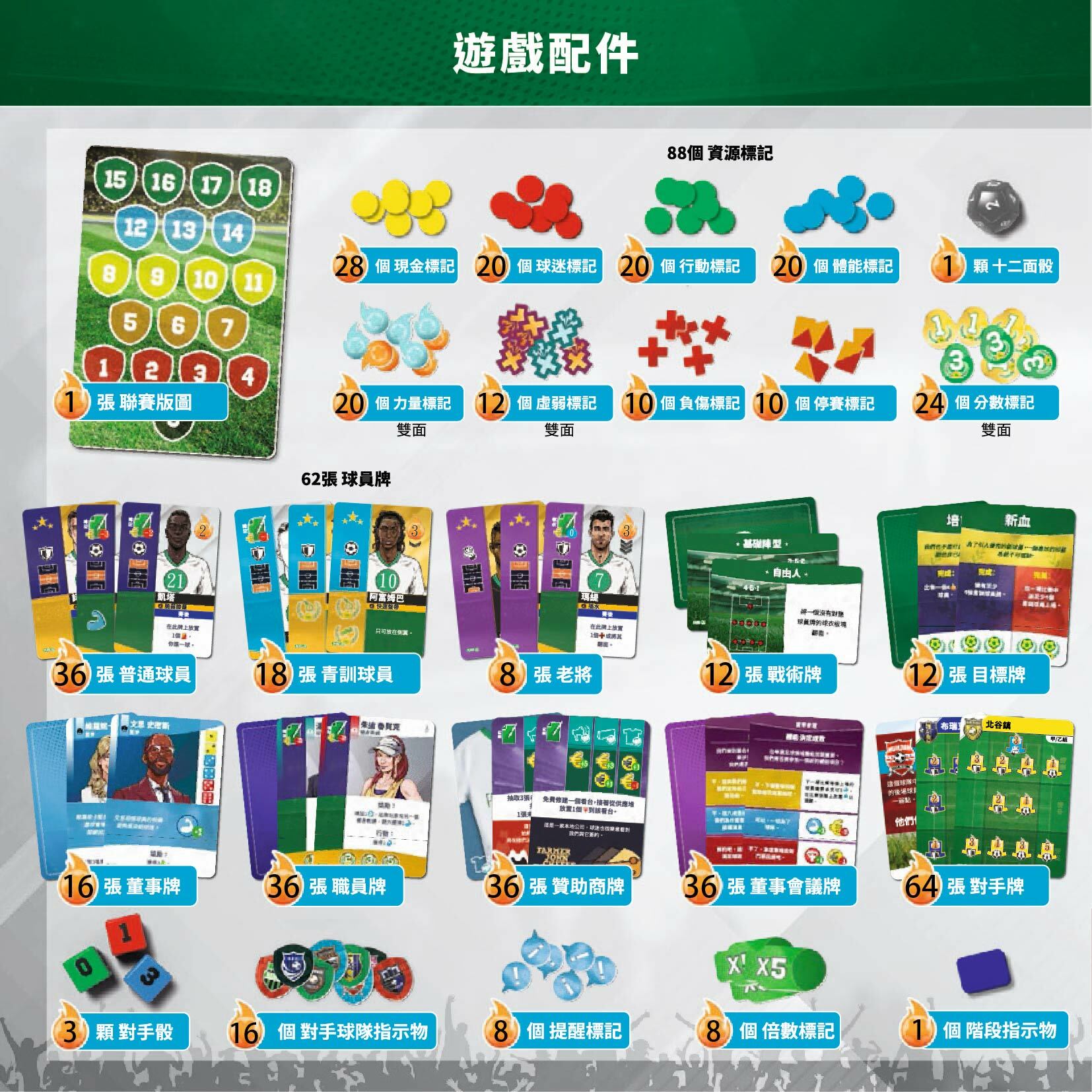 不只上百塊木製配件,遊戲的每個圖板也都升級為雙層圖板,讓配件放置不易晃動,球場圖板還特別印刷草地質感,讓視覺更加亮眼!